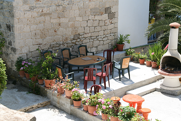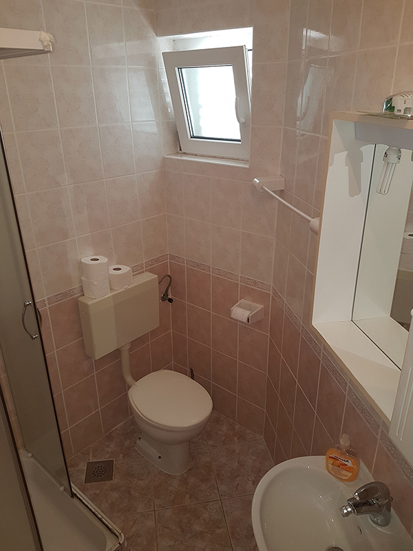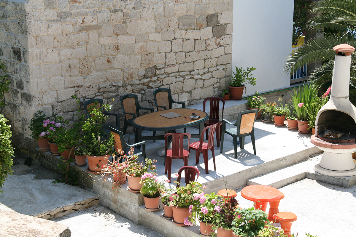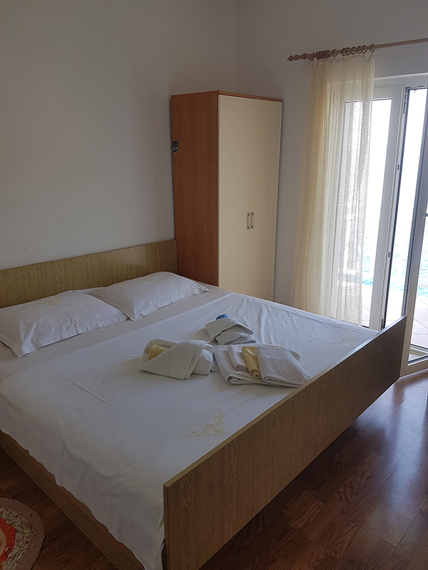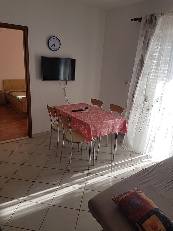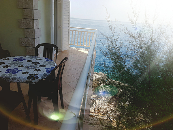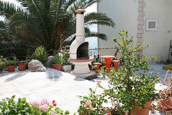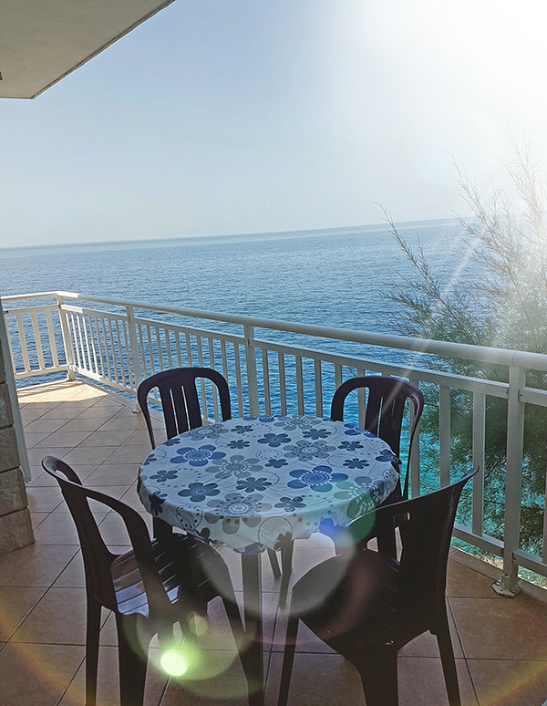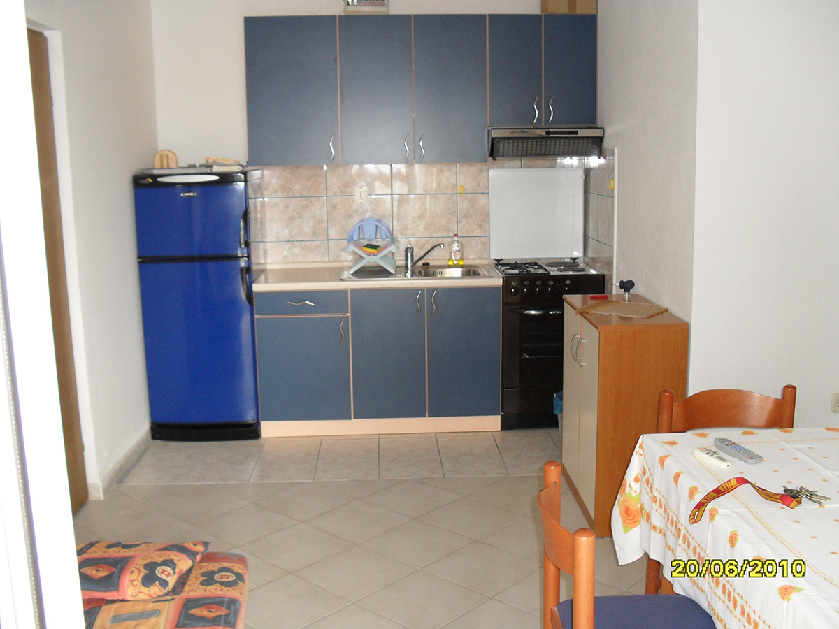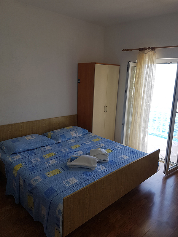 Plavi apartman, koji je svoj naziv dobio po boji kuhinje, nalazi se na prvom katu kuće kada se gleda s mora, dok se sam ulaz u apartman nalazi na istočnoj strani kuće u prizemlju. Apartman ima predivnu terasu udaljenu 5m od mora. Udaljenost do plaže je 30m. Apartman se sastoji od dnevne sobe sa kuhinjom (15 m2) u kojoj se nalazi trosjed na razvlačenje za spavanje 2 osobe (150x190 cm), spavaće sobe sa bračnim krevetom 180x200 cm (16 m2), kupaonice ( 6m2) i balkona sa terasom (15m2) udaljen 5 m od mora. Apartman je namjenjen za 4 osobe uz mogućnost dodatnog ležaja. Svi apartmani su klimatizirani i imaju besplatan wifi Internet. Iza kuće se nalazi terasa sa roštiljem na koju gosti mogu koristiti. Kuhinje su opremljene kompletnim posuđem i priborom za jelo. Posteljina i ručnici su uključeni i mijenjaju se tjedno.