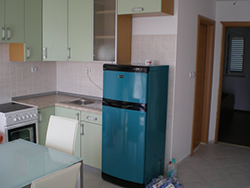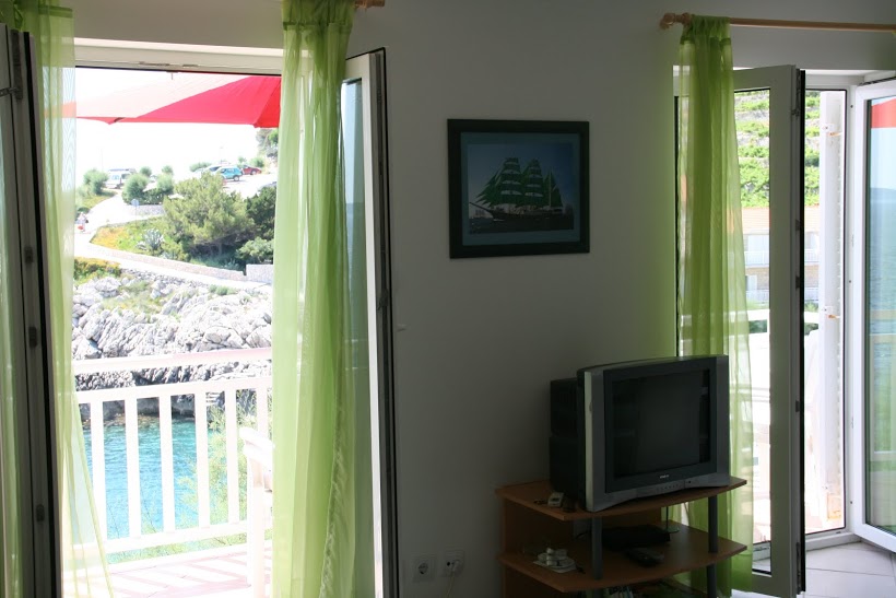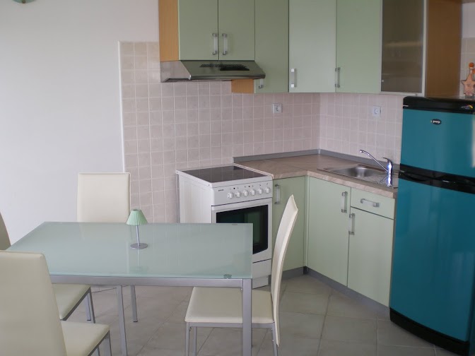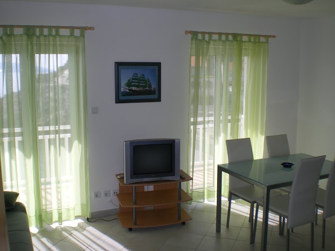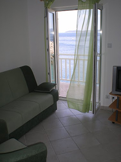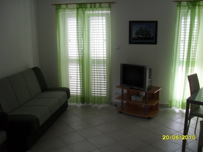 Zeleni apartman, koji je svoj naziv dobio po boji kuhinje, nalazi se na drugom katu kuće kada se gleda s mora, dok se sam ulaz u apartman nalazi na istočnoj strani kuće na prvom katu. Apartman ima predivnu terasu udaljenu 5m od mora. Udaljenost do plaže je 30m. Apartman se sastoji od dnevne sobe sa kuhinjom (22 m2) u kojoj se nalazi trosjed na razvlačenje za spavanje 2 osobe (150x190 cm), spavaće sobe sa bračnim krevetom 180x200 cm (17m2), kupaonice ( 6m2) i balkona sa terasom (10m2) udaljen 10 m od mora. Apartman je namijenjen za 4 osobe uz mogućnost dodatnog ležaja. Svi apartmani su klimatizirani i imaju besplatan wifi Internet. Iza kuće se nalazi terasa sa roštiljem na koju gosti mogu koristiti. Kuhinje su opremljene kompletnim posuđem i priborom za jelo. Posteljina i ručnici su uključeni i mijenjaju se tjedno.